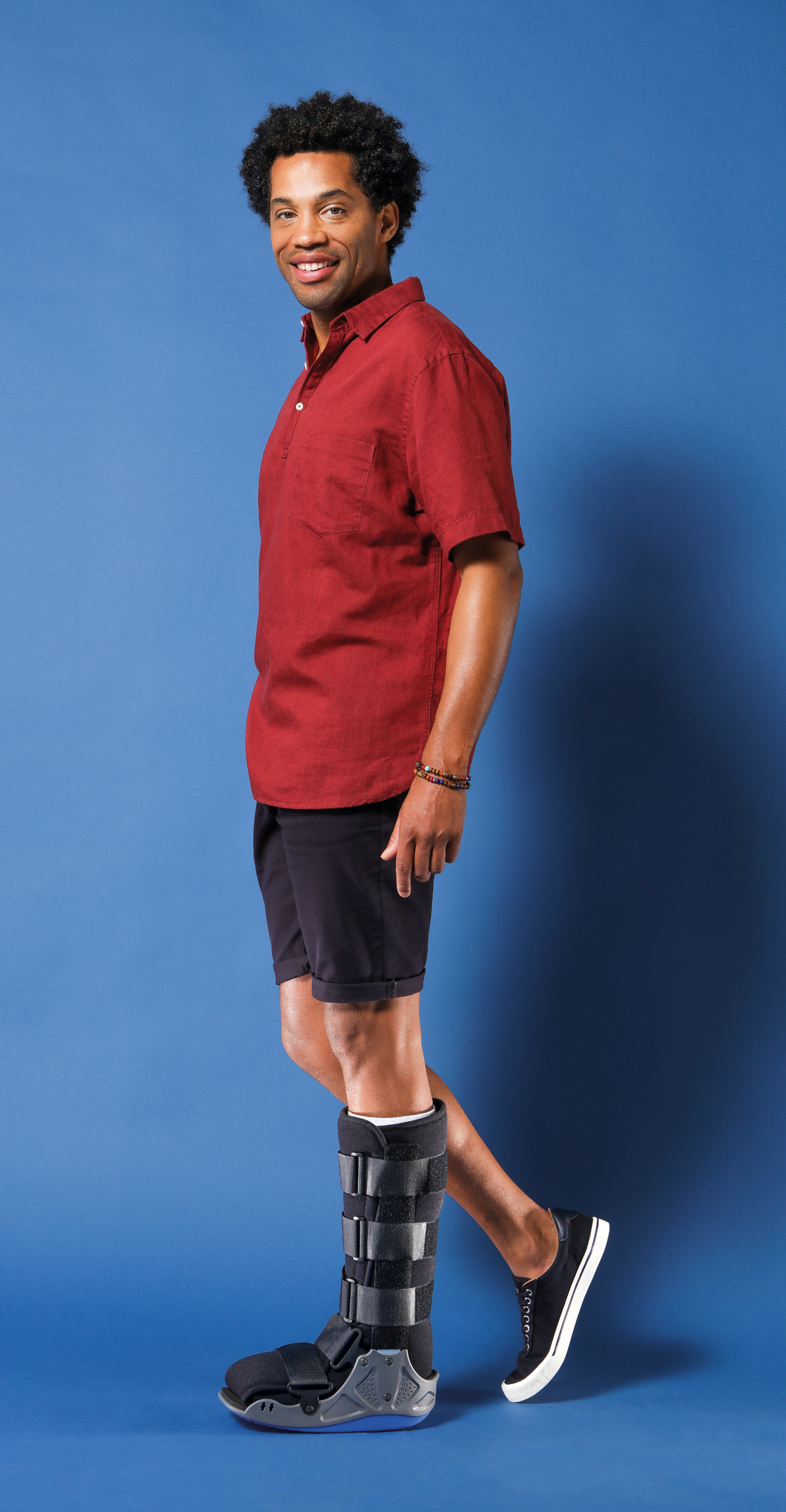 Bota ortopédica con soportes laterales rígidos que permite la inmovilización y la estabilización del tercio inferior de la pierna, el tobillo y el pie.